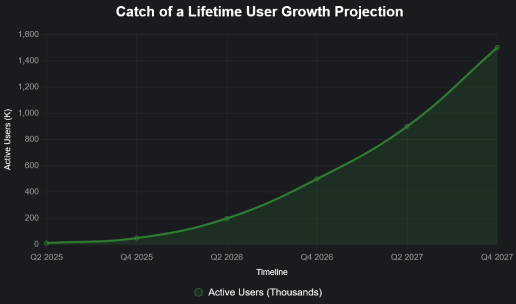 Launched in beta in March 2025, Catch of a Lifetime has garnered 12K sign-ups and an 82% retention rate in early testing, demonstrating strong market fit. The app aligns with Stoanhedge’s mission to invest in innovative, community-driven ventures within Opportunity Zones, offering both social value and financial returns. Future roadmap includes AR-guided outdoor adventures, live event streaming, and partnerships with outdoor brands like Patagonia. The app targets 1.5M active users by Q4 2027, with projected annual revenue of $18M.
